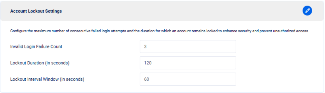 The Account Lockout Settings feature helps safeguard user accounts from unauthorized access by limiting repeated failed login attempts. This configuration allows administrators to define the maximum number of failed login attempts permitted before an account is temporarily locked, along with the duration of the lockout and the monitoring interval.&#x20;