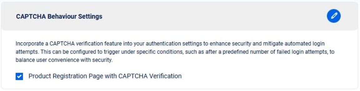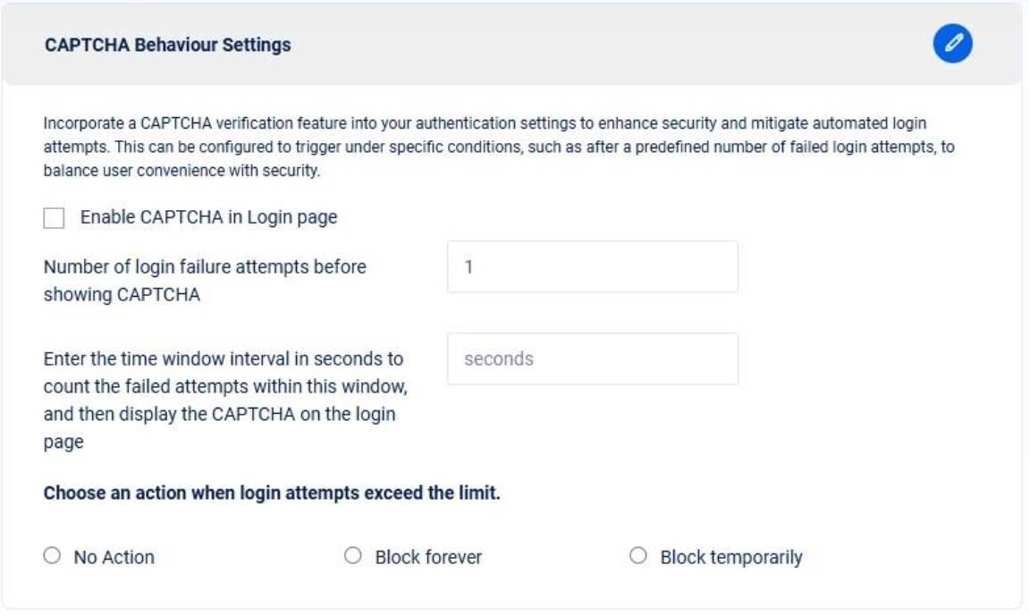 Enhance security by incorporating CAPTCHA verification into your authentication process. Configure it to trigger under specific conditions, such as after a set number of failed login attempts, ensuring a balance between user convenience and protection against automated login attempts.&#x20;
