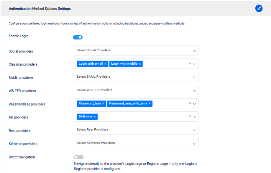 Configure your preferred login methods from a variety of authentication options including traditional, Social, Classical, SAML, WS-FED, AD, REST, Kerberos and Passwordless methods..&#x20;