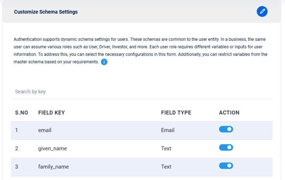 &#x20;***Customize Schema Settings:*** The authentication system supports dynamic schema settings to accommodate different user roles within a business. These schemas are common to the user entity and allow flexibility in managing role-specific requirements.&#x20;
