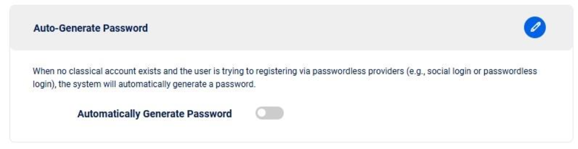 When a user registers through passwordless providers such as social login or passwordless authentication and no classical account exists, the system automatically generates a password.&#x20;