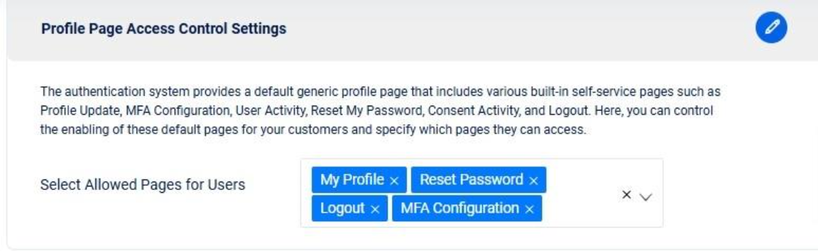 ***Profile Page Access Control Settings:*** The authentication system offers a default profile page with built-in self-service features like Profile Update, MFA Configuration, User Activity, Reset My Password, Consent Activity, and Logout. You can manage access to these pages by enabling or disabling them for your customers, allowing precise control over their availability.&#x20;