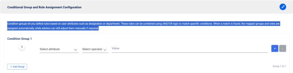 The Conditional Group and Role Assignment Configuration feature enables dynamic role and group assignment based on predefined user attributes such as department, designation, or other profile details. Administrators can create condition groups using logic to define complex rules that match specific user criteria.&#x20;