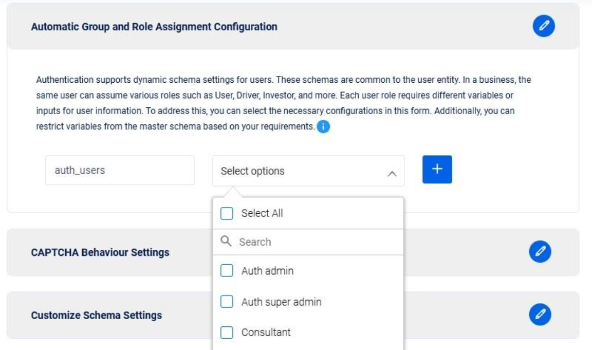 The authentication system provides dynamic schema settings to adapt to diverse user roles within your business. A single user entity can assume various roles such as User, Driver, Investor, etc., each requiring different variables or inputs for their respective information.&#x20;