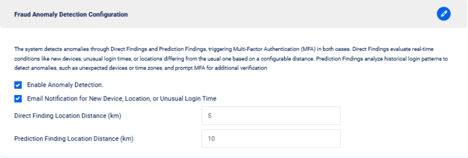 The Fraud Anomaly Detection Configuration feature enhances account security by identifying and responding to unusual login behaviors or potential fraudulent activities. It leverages both **Direct Findings** and **Prediction Findings** to detect anomalies and trigger additional verification through Multi-Factor Authentication (MFA).&#x20;