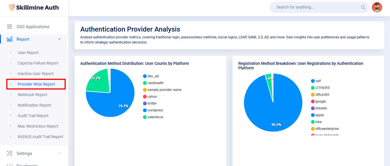 The **Authentication Provider Analysis** report provides a detailed evaluation of the various authentication methods used on the platform. By analyzing metrics across different providers and methods, it offers valuable insights into user preferences and usage patterns, aiding in strategic decision-making for authentication processes.
