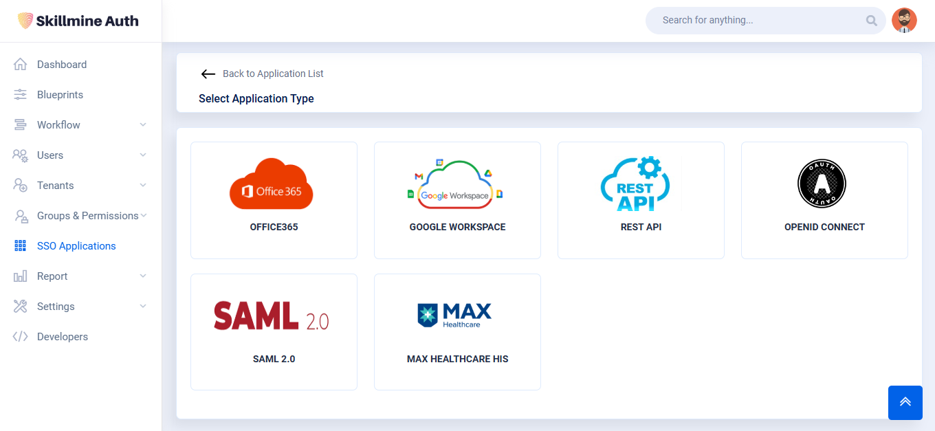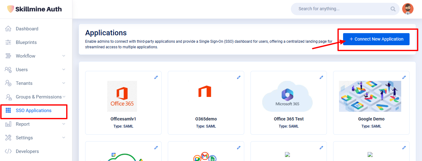 The **Applications** provides a robust interface for administrators to integrate third-party applications with the platform and deliver a Single Sign-On (SSO) dashboard for users. This feature simplifies access management and enhances user convenience by offering a centralized hub for multiple applications.