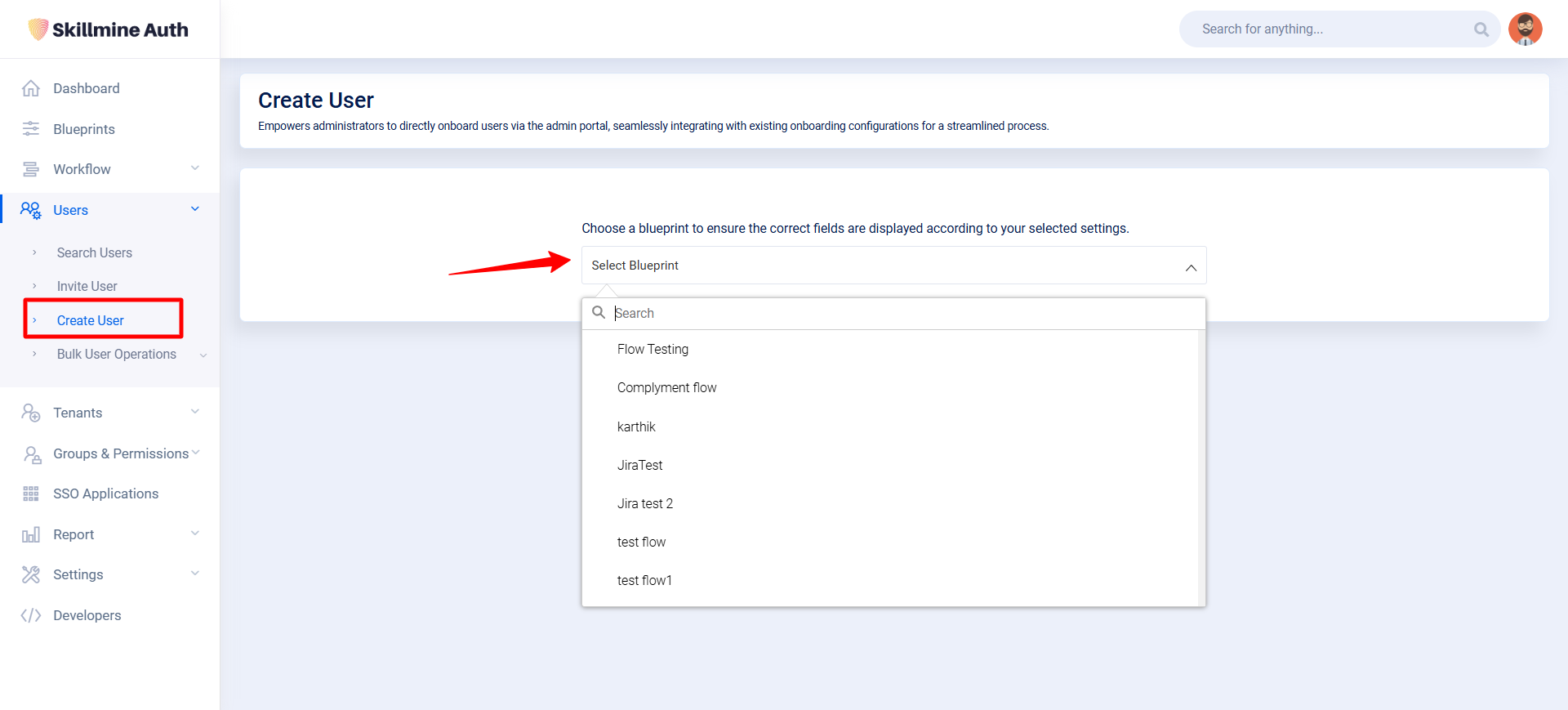 In the Admin Console, navigate to the "Users" tab and select the "Create User" option from the menu on the left. A list of available blueprints will appear in the dropdown menu on the right.